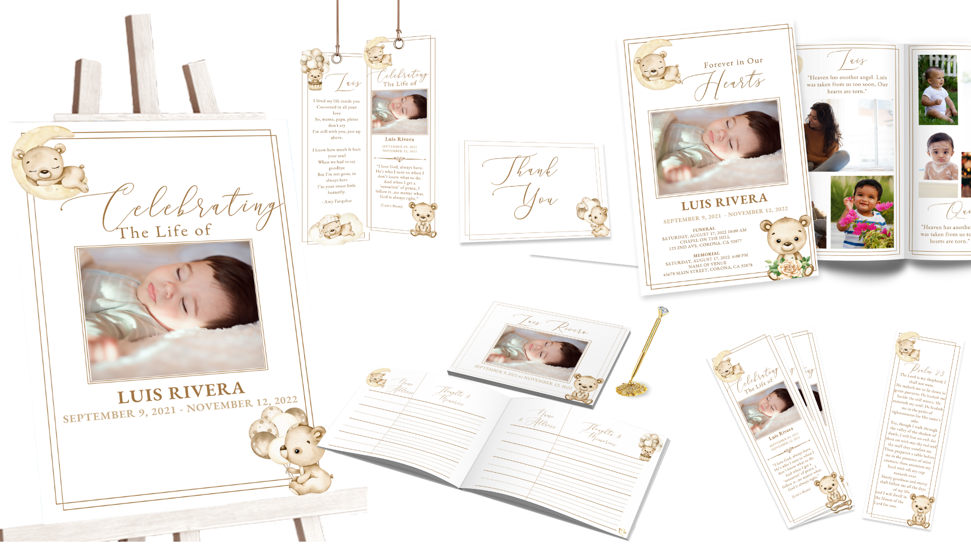 Losing a loved one, especially when it's a child, is an incredibly heartbreaking experience. To help lighten your burden during this difficult time and to make this process easier for you, I offer a digital funeral program template for a child with sweet teddy bears and moons. Simply purchase, change pictures and text, download, and print the templates for a seamless yet beautiful addition to your dearly departed’s memorial. These sweet teddy bear templates will become treasured keepsakes to honor and remember your little loved one.