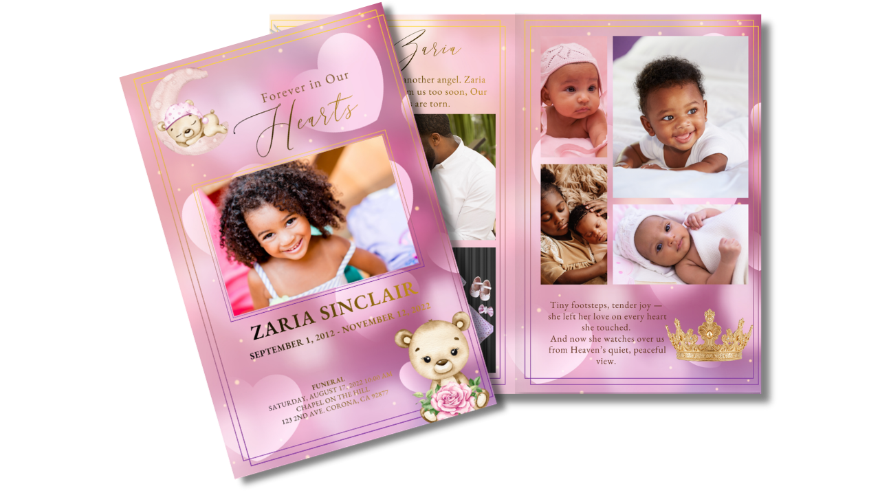 Soft pink and lavender tones, delicate gold accents, and tender illustrated details create a gentle tribute filled with sweetness and light. The warm, comforting design honors a precious little life whose laughter, innocence, and beautiful spirit will forever be treasured in loving hearts.