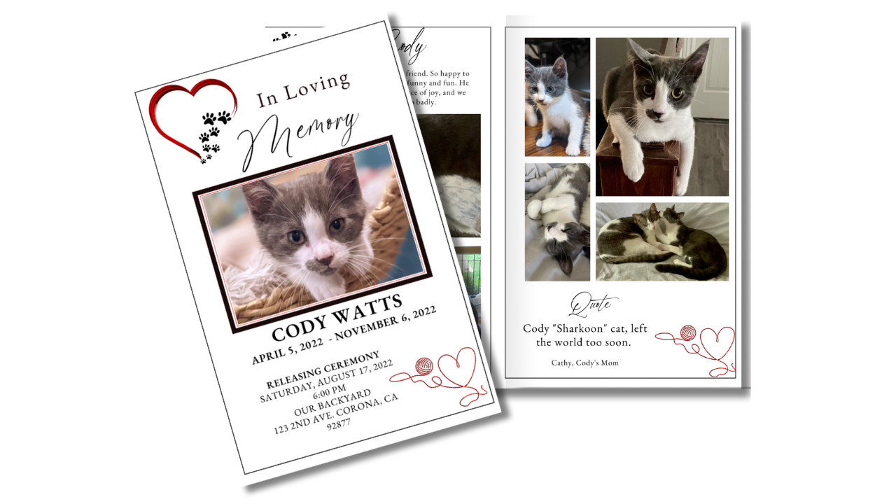 Created to honor the quiet comfort, playful moments, and gentle companionship of a beloved cat, the Furry Friends memorial program offers a warm and heartfelt way to share photos, memories, and love. Soft details and a cozy layout reflect the bond you shared. Fully editable in Canva, this template is simple to personalize and print with care.