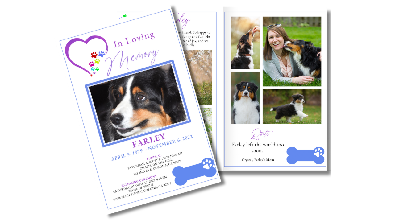 Created to honor the faithful companionship and unconditional love of a beloved dog, this Rainbow Bridge memorial program offers a tender way to share photos, memories, and words of remembrance. Soft colors, paw-print details, and a peaceful layout help families reflect on a loyal friend now running free beyond the Rainbow Bridge, yet forever close in heart and memory. Fully editable in Canva, this template is designed to be easy to personalize and print.