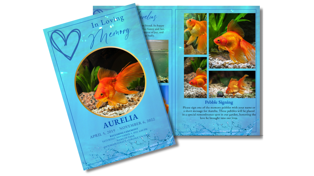 Peaceful, gentle, and filled with quiet beauty, the Golden Waters funeral program was created to honor the life of a beloved aquatic companion. With calming blue tones, soft water imagery, and a serene layout, this design offers a comforting way to share photos, memories, and service details while reflecting the tranquility they brought into your life.