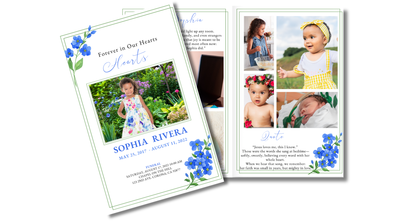 A gentle garden-inspired design featuring delicate blue blossoms, soft greenery, and peaceful white space that brings calm and quiet beauty to every page. This template offers a loving and graceful way to honor a little life forever cherished.