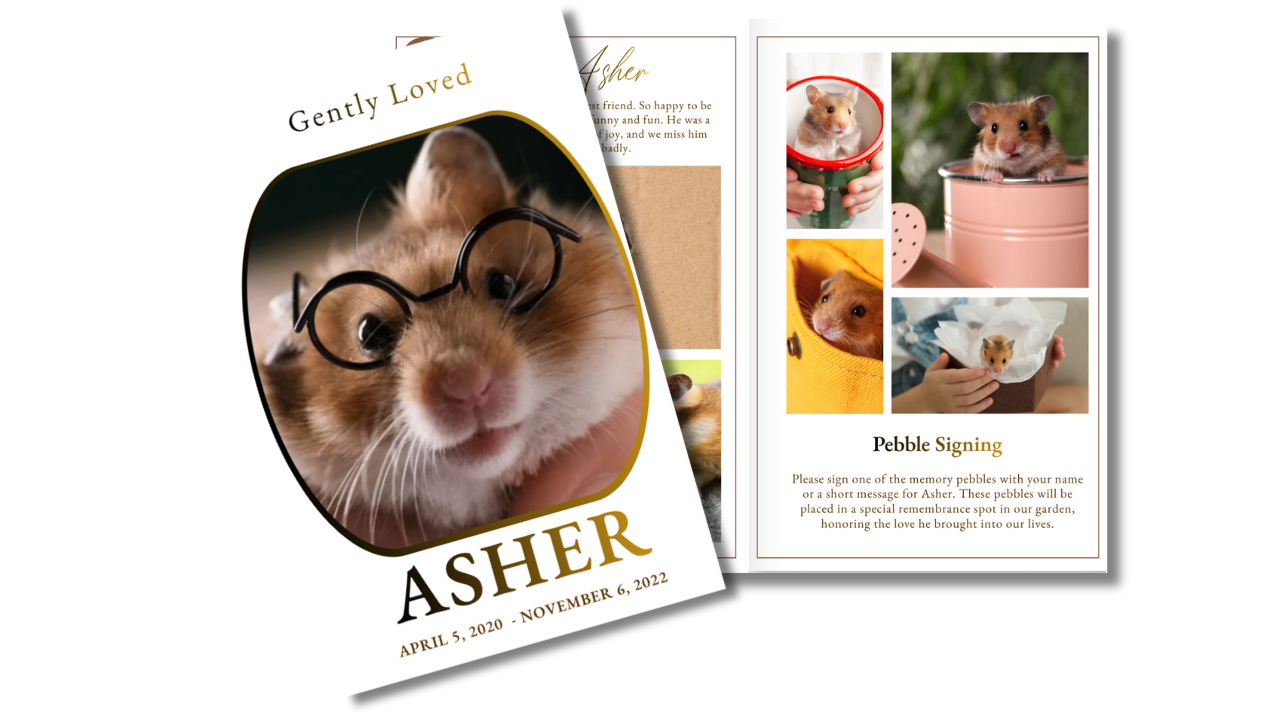 Soft, gentle tones and delicate gold accents come together in a design that feels tender, comforting, and full of love. Thoughtfully arranged with sweet details and a warm, peaceful presence, this program honors the quiet joy and companionship your tiny friend brought into your life. It’s a heartfelt way to remember a small soul who made a big and lasting impression.