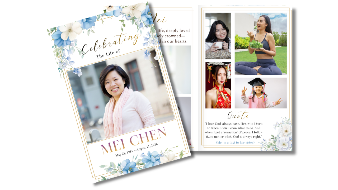 Soft blue blossoms and delicate white florals come together in a design filled with peace, faith, and gentle remembrance. The light, airy palette and graceful botanical accents reflect a life rooted in love, strength, and quiet devotion. Thoughtfully arranged to highlight treasured photographs and heartfelt memories, this program offers a beautiful way to celebrate a beloved woman whose faith and love continue to shine in the hearts of those she touched.