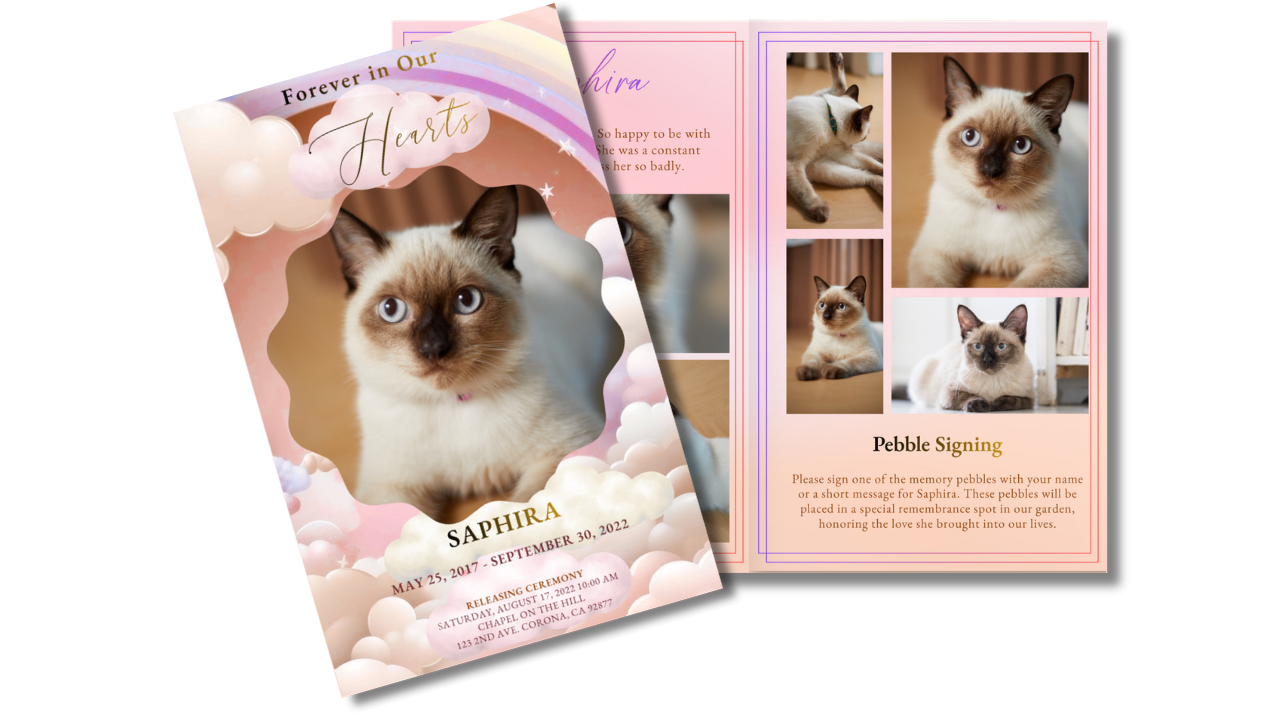Soft blush skies, gentle clouds, and delicate rainbow hues create a tender tribute filled with warmth and quiet comfort. The dreamy pastel design honors a beloved companion whose gentle presence and loving spirit will forever remain close to the heart.