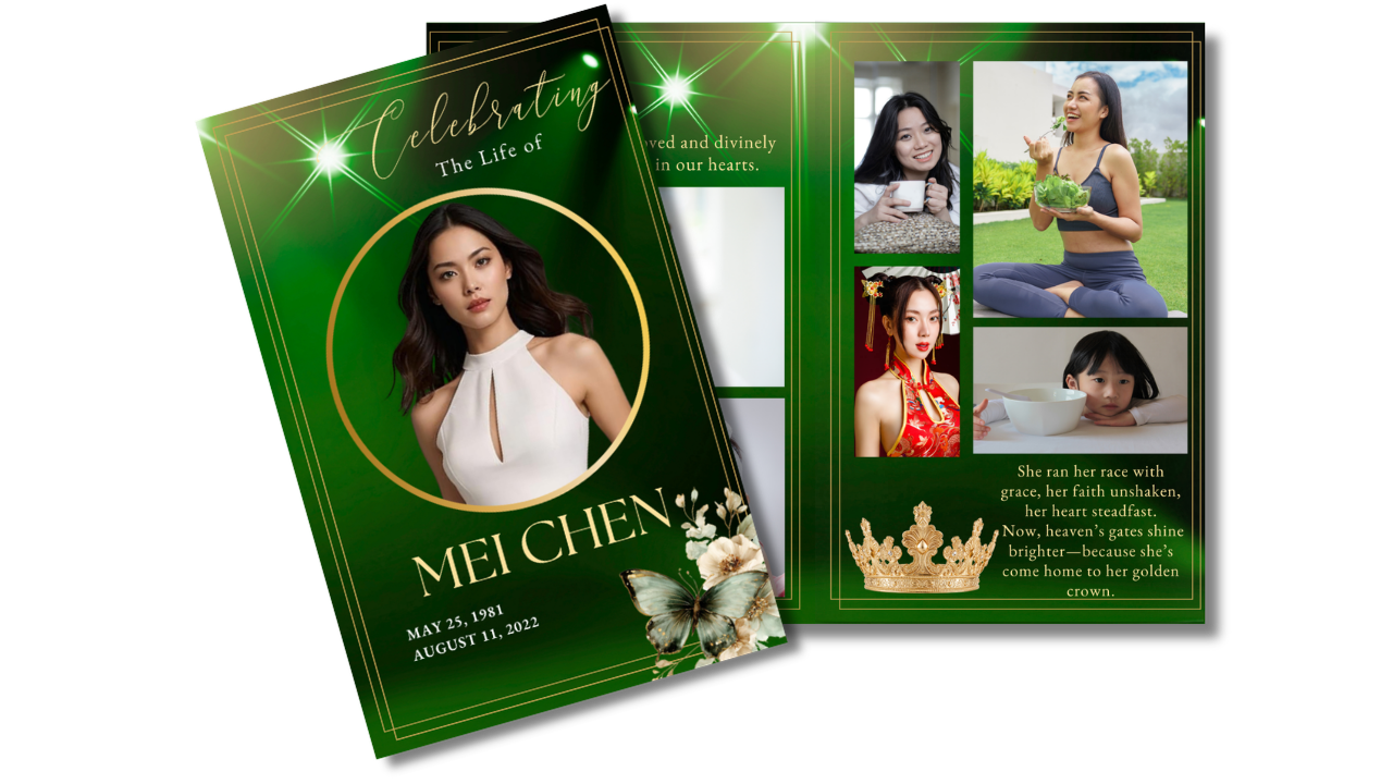 Deep emerald tones paired with radiant gold accents create a design that feels both rich and full of life. Soft light reflections and elegant detailing bring a sense of peace, renewal, and quiet strength to each page. With its vibrant yet refined presence, this program offers a beautiful tribute to a woman whose life was full of grace, resilience, and enduring love.