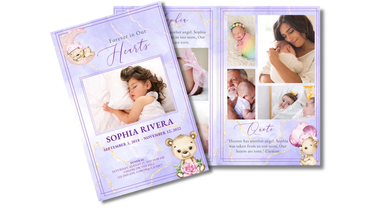 Soft lavender tones, gentle gold accents, and tender illustrated details create a loving tribute that reflects innocence, beauty, and eternal connection. The delicate colors and comforting design honor a precious little life whose memory will always be held close in the hearts of those who love her.