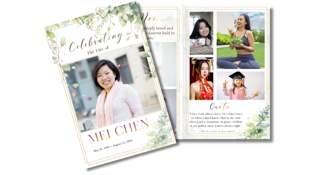 Soft eucalyptus leaves and gentle greenery create a calm, refreshing tribute filled with peace, grace, and quiet remembrance. The airy botanical design and light natural tones reflect a life remembered for kindness, serenity, and a spirit that brought comfort to those around her. Thoughtfully arranged to highlight treasured photographs and heartfelt memories, this program offers a beautiful way to celebrate a beloved woman whose presence will always feel close and gently remembered.