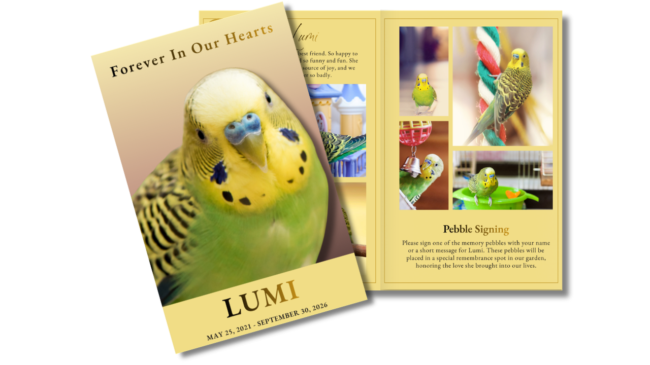 Warm golden tones and a soft, radiant backdrop create a loving tribute filled with light, joy, and cherished memories. The design gently highlights the bright spirit and playful personality of a beloved feathered friend, capturing the happiness and companionship they brought into everyday life. Thoughtfully arranged to showcase treasured photos and special moments, this program offers a heartfelt way to honor a little life that filled a home with song, color, and love.