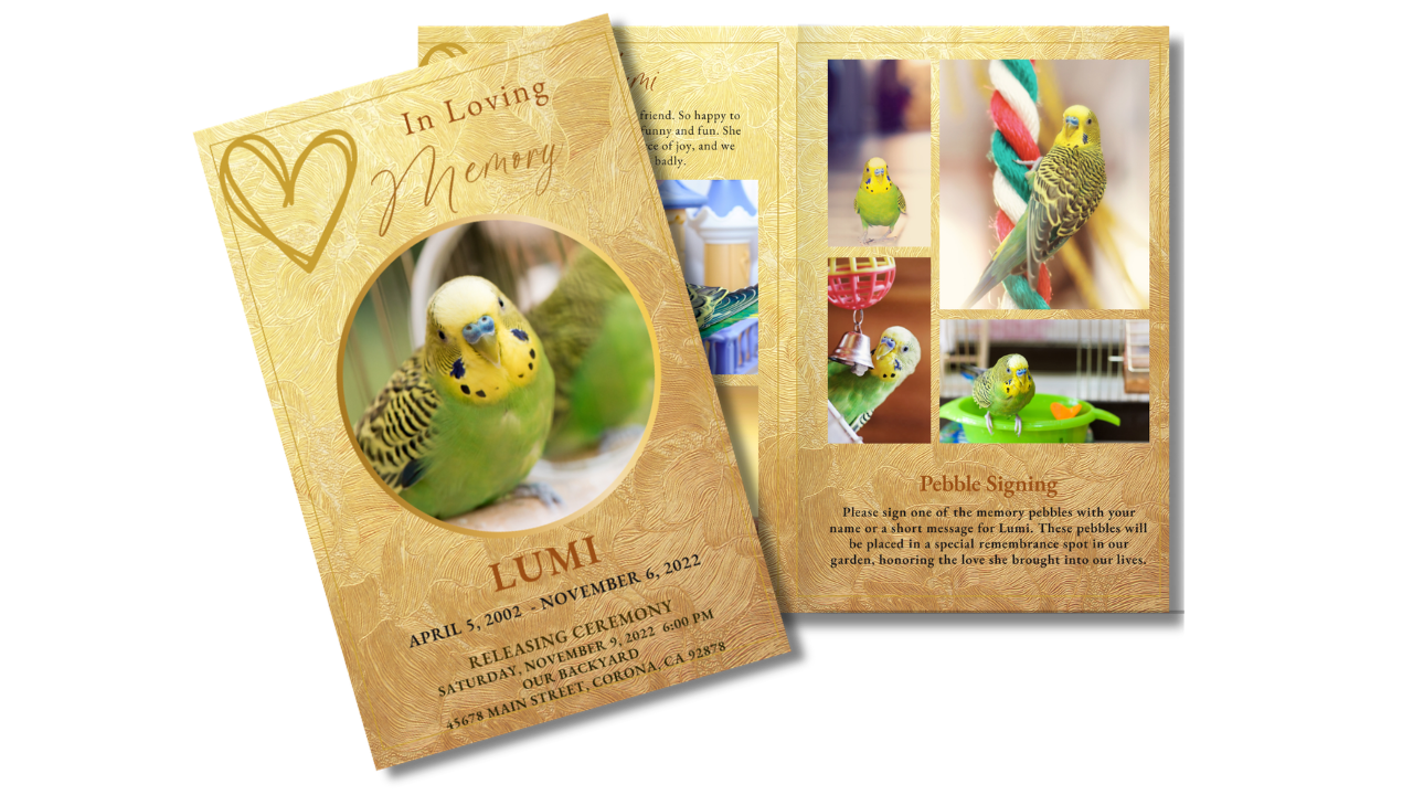 Warm golden tones and soft textured details create a radiant tribute that reflects the light, joy, and companionship shared with a beloved friend. The rich gold hues and gentle design honor a cherished bird whose presence filled each day with comfort, beauty, and lasting love.