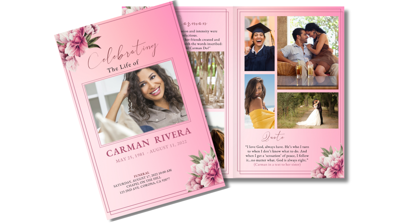 The Blushing Peonies Funeral Program is a soft blush floral design created to honor a beautiful life with grace and tenderness. Gentle peony blooms and airy pink tones offer a comforting, feminine tribute filled with warmth, remembrance, and love. Fully editable in Canva, this template is designed to be easy to personalize and print.